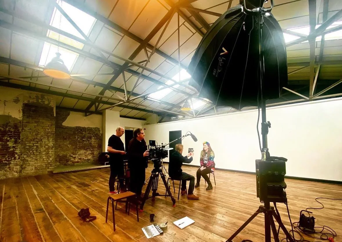 A person being filmed sitting on a chair in a studio with camera crew, lighting, and a plain white wall.